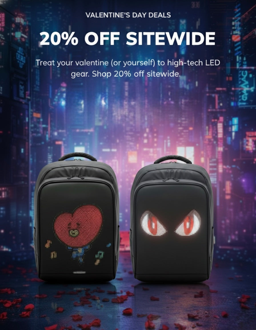Programmable LED Screen • Water-Resistant • TSA Carry-on Friendly • Built-in Laptop Sleeve • Large Backpack • Perfect for motorcycle riders, college students, teenagers, and tech savvy people